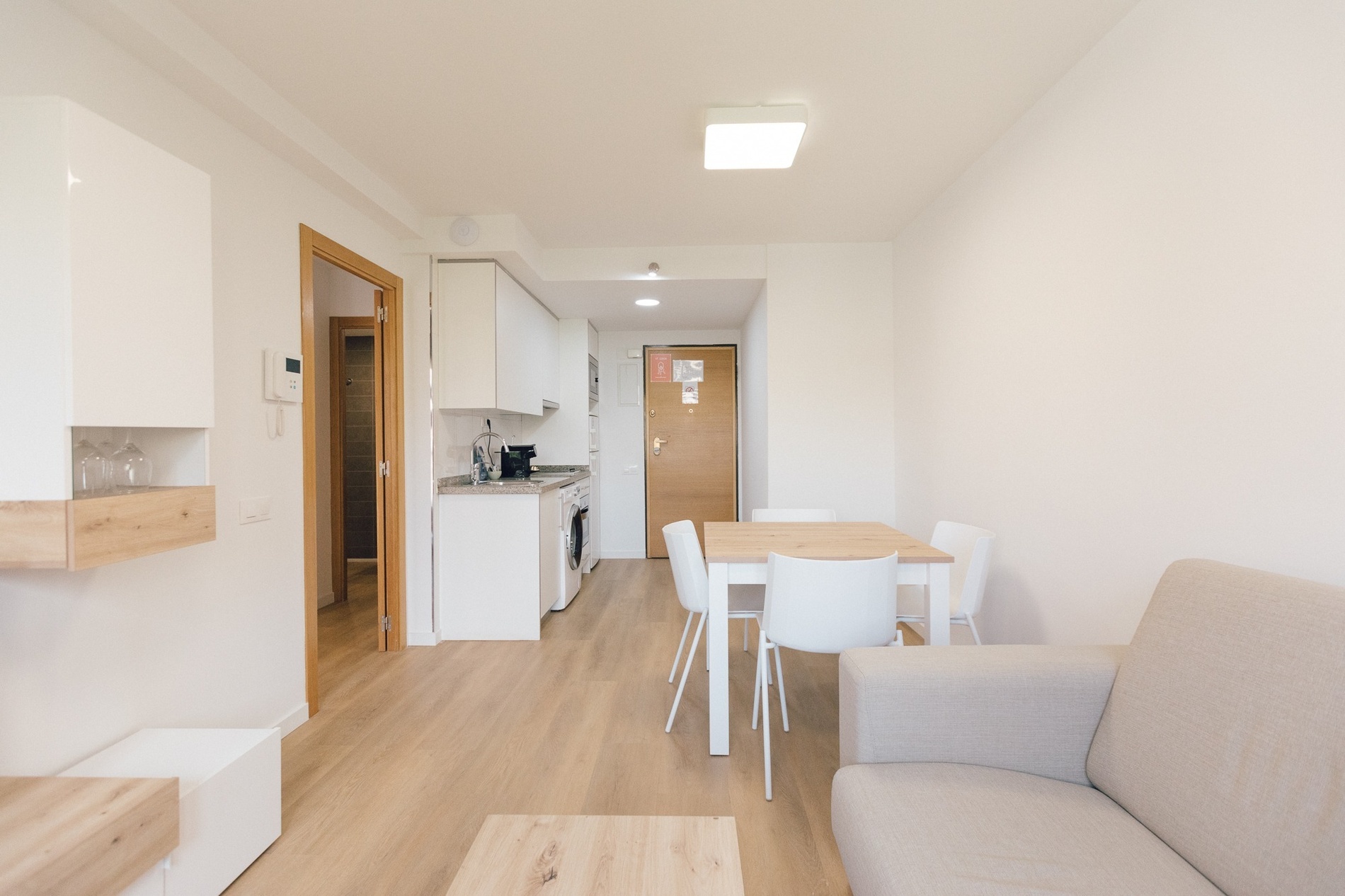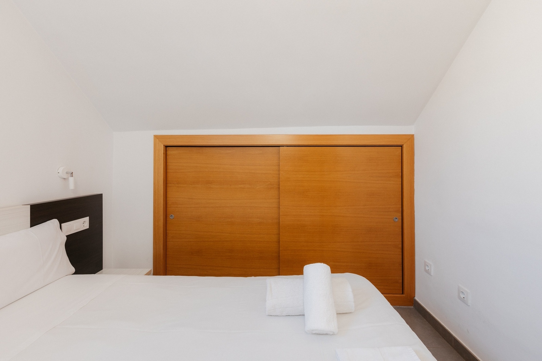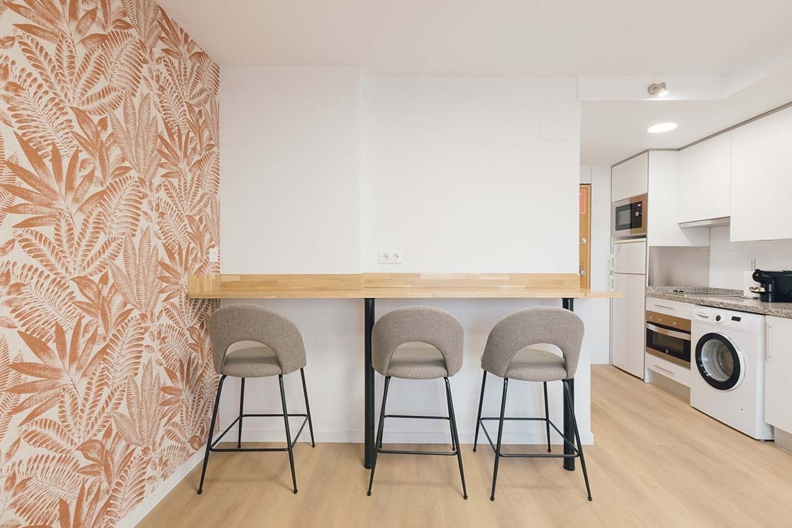 40 m² apartment for 1 or 2 people with one bedroom with a 1.50 m double bed or two 0.90 m single beds. The bedroom has a private bathroom with shower, a living/dining room with a sofa bed, and a fully equipped open-plan kitchen. Exterior balcony.